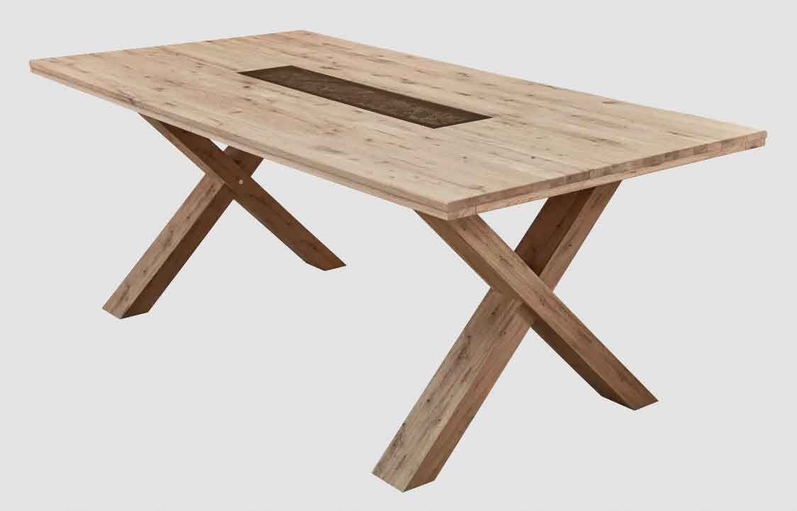 Der Esstisch mit der massiven Tischplatte aus wildeiche überzeugt mit seinem außergewöhnlich rustikalem Design. Dies begründet sich einerseits im Holz selbst, dessen intensiv gemaserte und gebürstete Oberfläche eine tolle Haptik aufweist. Andererseits erinnert das gekreuzte Wangengestell an urige Holztische, wie man sie als Picknicktisch oft mitten in der Natur findet. Die Glaseinlage mit der integrierten Korkschicht bildet einen besonderen Eyecatcher und schafft einen Übergang zur Modernität. Dem dadurch entstandenen Charme kann man sich wahrlich nur schwer entziehen. Belohnen Sie sich mit diesem 200x100 cm großen Holztisch und freuen sich auf gemütliche Stunden mit Ihren Liebsten.
