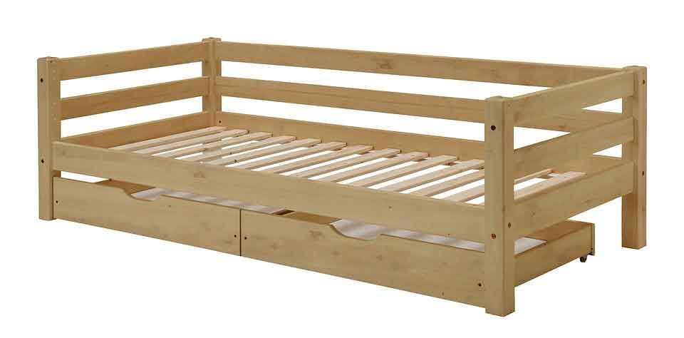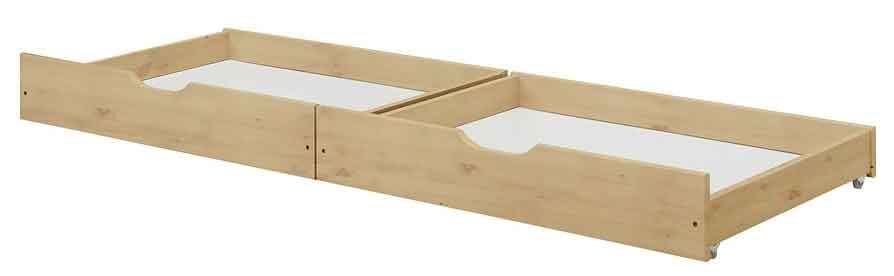 Anders als ein klassisches Etagenbett wirkt diese Bettkombination für 2 Kinder viel luftiger und leichter. Sie nimmt fast genauso wenig Platz ein, fühlt sich aber deutlich offener an. Das Unterbett nutzt den Raum unter dem Hochbett teilweise aus, ohne dabei ein beengendes Gefühl zu erzeugen. Kinder, die sich beim Schlafen mehr Freiheit wünschen und sich in engen Betten schnell unwohl fühlen, werden es lieben. Die Liegefläche von 90x200 cm bietet in beiden Betten ausreichend Platz. Das Oberbett ist mit einem 3/4 Rausfallschutz ausgestattet und sorgt so für maximale Sicherheit. Zusätzlichen Stauraum bieten die zwei praktischen Roll-Schubladen unter dem Unterbett. Hier lassen sich Bettwäsche, Kleidung oder Spielsachen ordentlich und platzsparend verstauen. Die passenden Lattenroste sind bereits im Lieferumfang enthalten, passende Matratzen für Kinder gibt es optional. Selbstverständlich ist das Hochbett TÜV-geprüft und erfüllt alle wichtigen Sicherheitsstandards. Gefertigt aus massiver Kiefer und erhältlich in den Ausführungen natur, gelaugt oder weiß lasiert ist das Bett für Geschwister aufgrund des Einsatzes von umweltverträglichen Materialien und Chemiekalien auch eine Investition für ein gesundes Schlafumfeld.