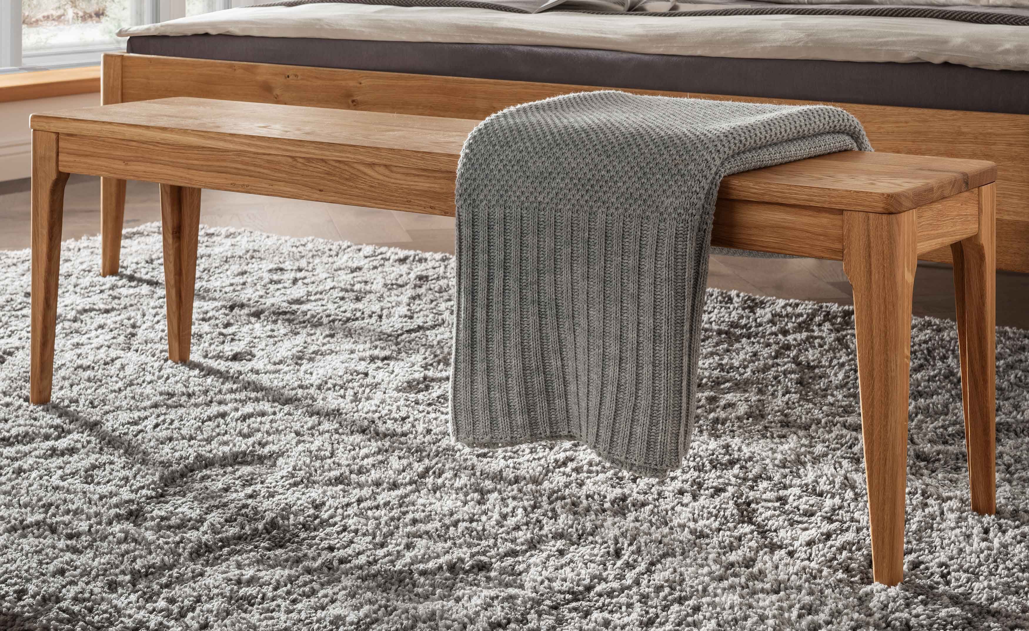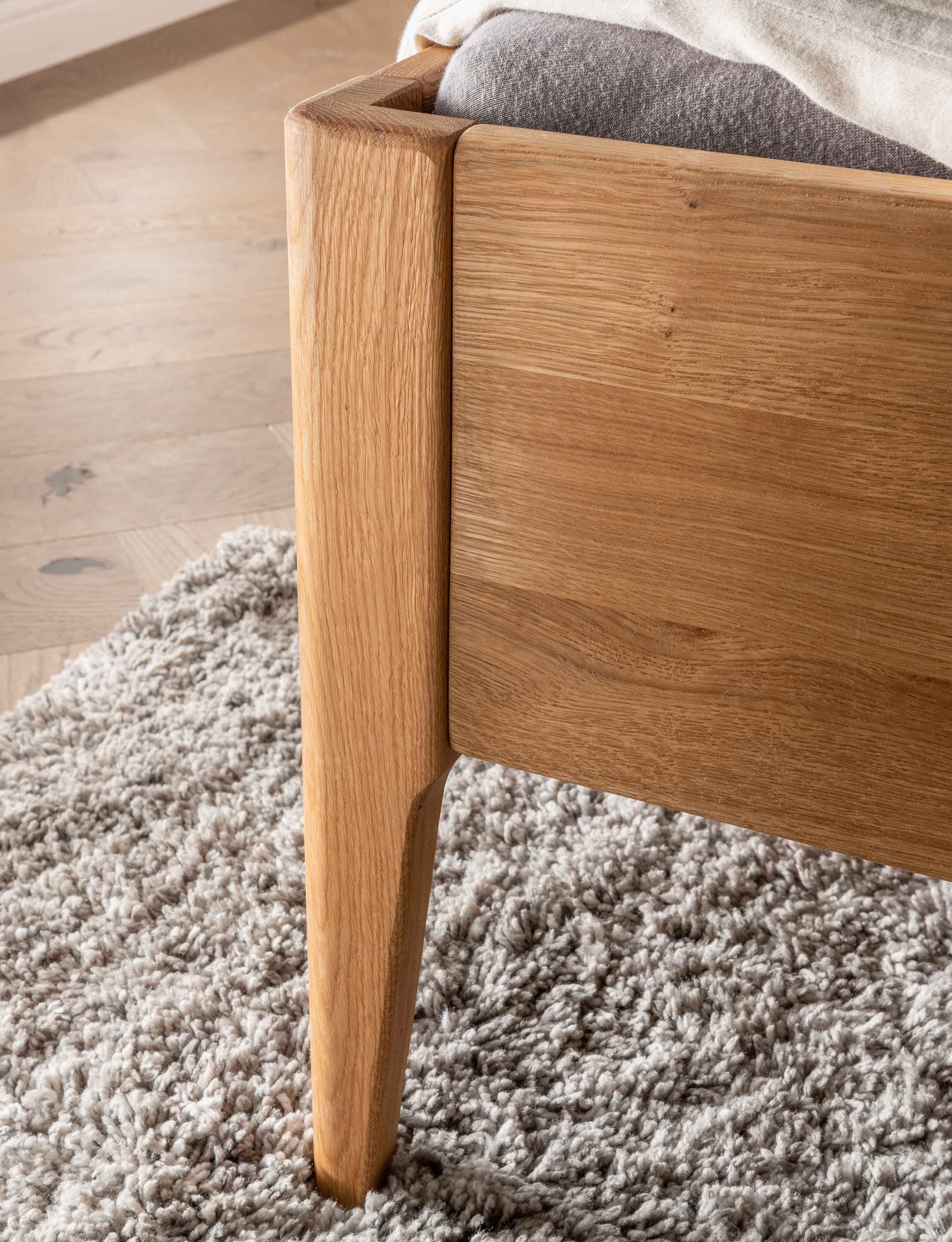 Mit diesem Holzbett aus massiver Wildeiche holen Sie sich skandinavisches Flair verbunden mit zeitloser Eleganz, natürlicher Wärme und langlebiger Qualität in Ihr Schlafzimmer. Die hohen, konischen Holzfüße verleihen dem Bett eine elegante Leichtigkeit und sorgen gleichzeitig für Stabilität sowie praktische Bodenfreiheit. Das schräg gestaltete, reduzierte Holzkopfteil unterstreicht den nordischen Charakter und bietet angenehmen Komfort beim Anlehnen. Gefertigt aus massiver Wildeiche, begeistert jedes Bett durch seine individuelle Maserung und warme Farbgebung und macht jedes Schlafzimmer zu einem Ort der Ruhe und Natürlichkeit. Das Massivholzbett ist in zahlreichen Größen vom Einzelbett bis zum großzügigen Doppelbett in 200x200 cm erhältlich und passt sich damit flexibel unterschiedlichen Wohn- und Schlafbedürfnissen an. Für besonders große Menschen ist das Bett auch in Überlänge mit 220 cm verfügbar.
