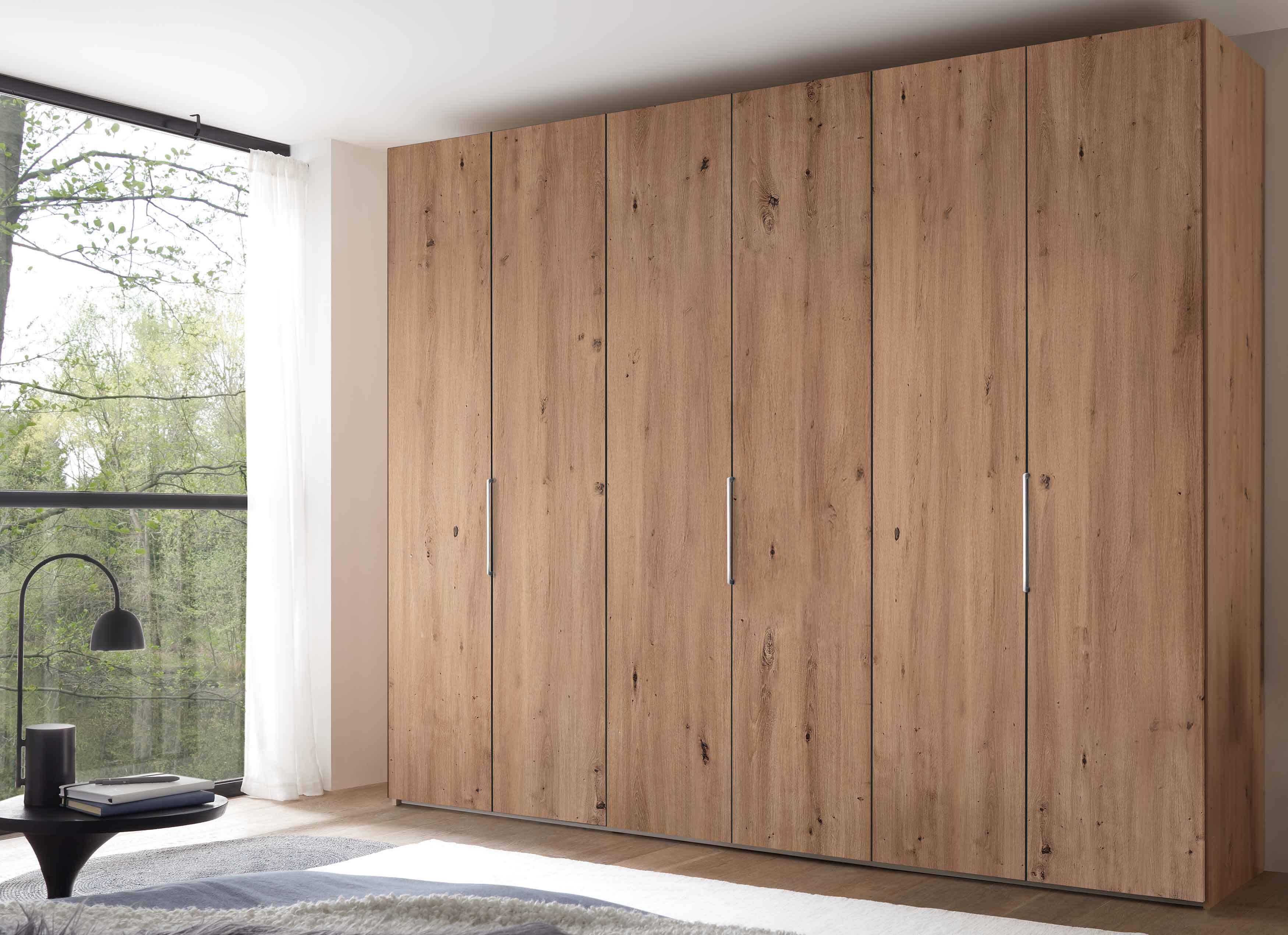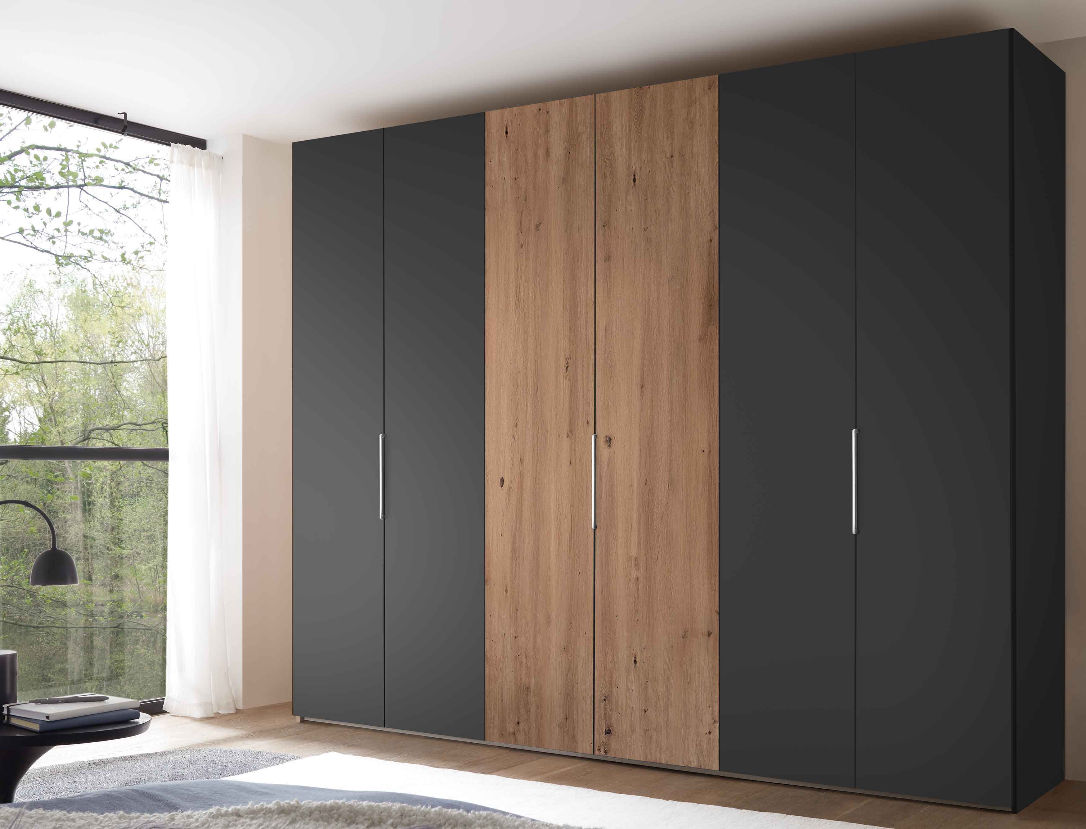 Den Staud Kleiderschrank mit Drehtüren erhalten Sie in vier Farben. Wer auf eine ruhige, klare Optik Wert legt und flexibel bleiben möchte, trifft mit einem weißen Schrank eine gute Wahl. Er eignet sich ideal für kleine oder eher dunkle Schlafzimmer, da Weiß das Licht reflektiert und den Raum optisch vergrößert. Ein sandfarbener Kleiderschrank wirkt wärmer und gemütlicher und entfaltet bei viel Tageslicht seine volle Wirkung. Besonders gut passt Sand zu zu hellen Holzmöbeln, Textilien in Erdtönen und sanften Farbakzenten. Wer es moderner und ausdrucksstärker mag, greift zu einem anthrazitfarbenen Kleiderschrank. Anthrazit wirkt besonders edel in Kombination mit hellen Wänden und passt gut zu urbanen, industriellen oder minimalistischen Wohnstilen. Da dunkle Farben das Licht schlucken, empfiehlt sich Anthrazit eher für größere oder sehr helle Schlafzimmer. Ein Kleiderschrank im Eiche-Dekor verbreitet eine natürliche, wohnliche Stimmung und wirkt warm und behaglich. Außerdem ist er pflegeleicht und unempfindlicher gegenüber Staub oder kleinen Gebrauchsspuren als eine unifarbige Oberfläche. Wählen Sie die passende Größe aus 4 Breiten und 2 Höhen und organisieren Sie den Stauraum im Kleiderschrank mit verschiedenen Ausstattungspaketen, so dass auch die inneren Werte des Extenso von Staud für Sie optimal sind.