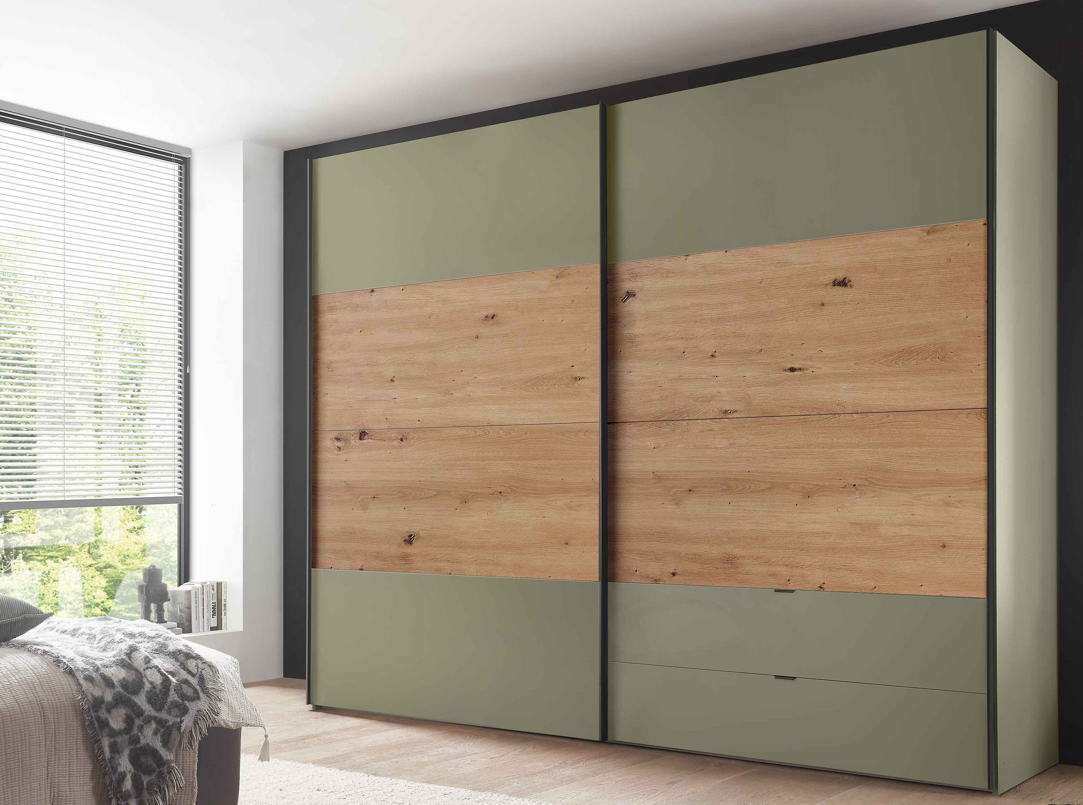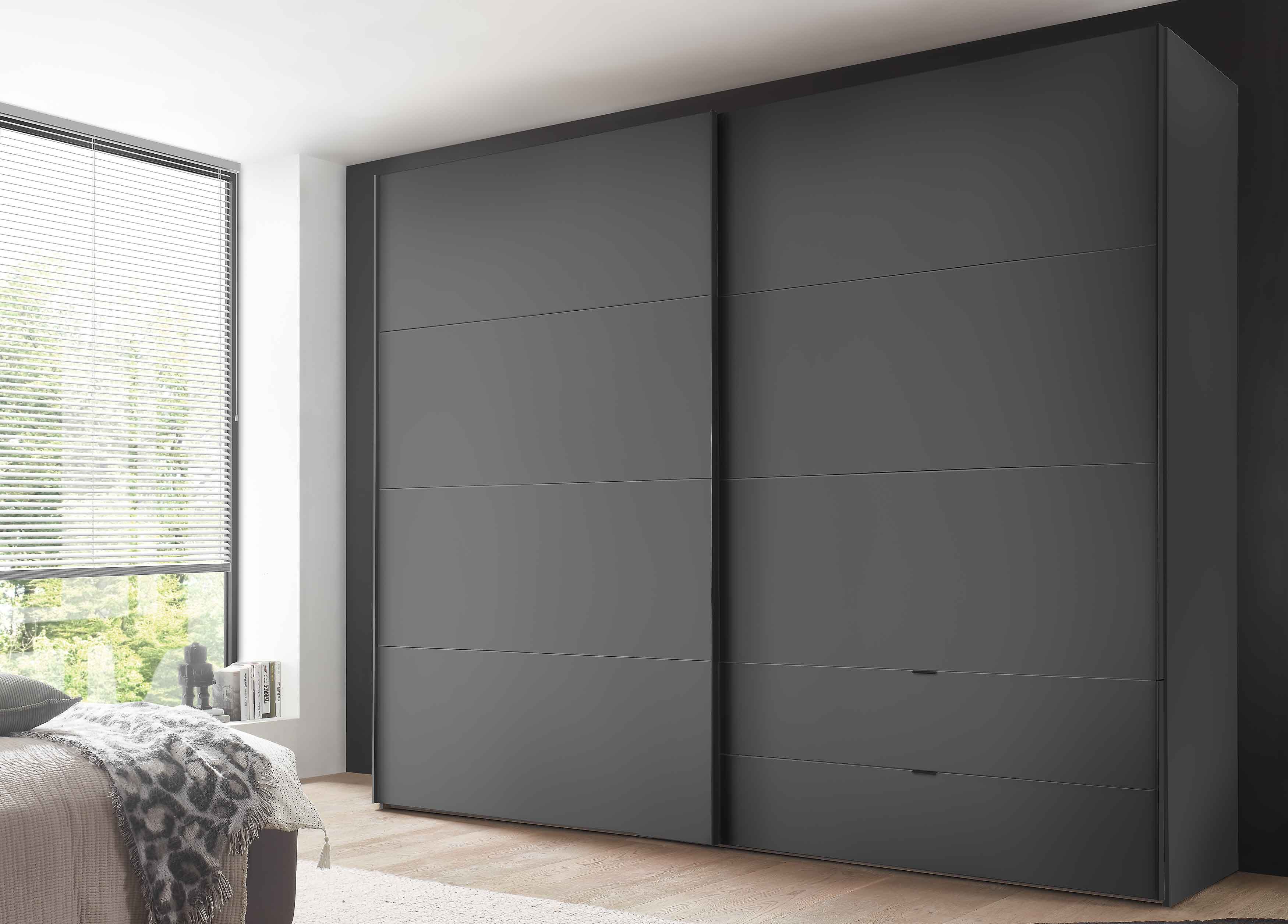 Dieser Staud Schwebetürenschrank bietet nicht nur viel Stauraum, sondern auch viele individuelle Gestaltungsmöglichkeiten. Erhältlich in Breiten von 250 bis 330 cm passt sich dieser Schrank perfekt an verschiedene Raumgrößen an und sorgt so für maximale Ordnung im Schlafzimmer Neben den zwei großen Schwebetüren ist der Schrank mit praktischen Schubladen ausgestattet, in denen sich kleine Wäschestücke und schwer stapelbare Dinge wie Tücher, Socken oder Accessoires ordentlich verstauen lassen. Das Innere des Kleiderschranks ist im modernen Texline-Dekor gehalten und bietet vier großzügige Fächer. Jedes Fach ist mit zwei Böden und einer Kleiderstange ausgestattet, so dass Ihre Kleidung ordentlich aufgehängt und organisiert werden kann. Für mehr Komfort können Sie den Paros zusätzlich mit funktionalem Zubehör ausstatten. Türdämpfer, die für ein sanftes und leises Schließen der Türen sorgen, gewähren ein Plus an Komfort im täglichen Gebrauch. Was die Gestaltung betrifft, haben Sie die Möglichkeit, verschiedene Segmente aus einer Palette von fünf Dekoren auszuwählen, um den Schrank ganz nach Ihrem Geschmack und Stil zu gestalten.