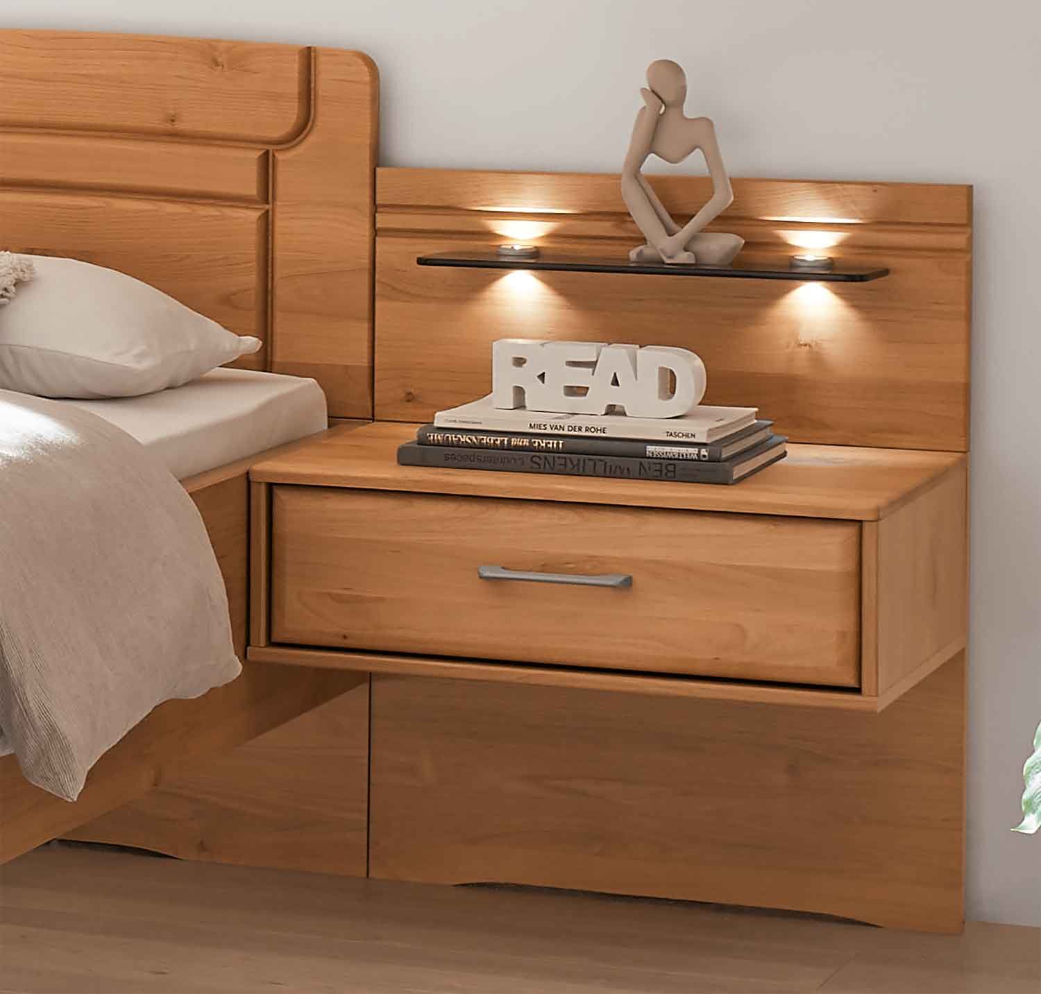 Der schwebende Nachttisch ist mit einer Schublade ausgestattet, in welcher allerlei Utensilien rund um eine angenehme Nachtruhe aufbewahrt werden können. Dank der Dämpfungsbeschläge schließt diese nahezu geräuschlos und vermeidet Verletzungen, sich den Finger einzuquetschen, wenn man in der Dunkelheit tastet. Über der Ablagefläche kann man ein Rückwandpaneel anbringen, welches sich harmonisch in`s Gesamtbild integriert und die Wand vor Beschädigung und Verschmutzung schützt. Außerdem verbreitet die optionale Beleuchtung des Rauchglasbodens ein gemütliches Stimmungslicht im Schlafzimmer. Wer weiteren Stauraum wünscht, kann auch den Nachtschrank mit drei Schubladen wählen.