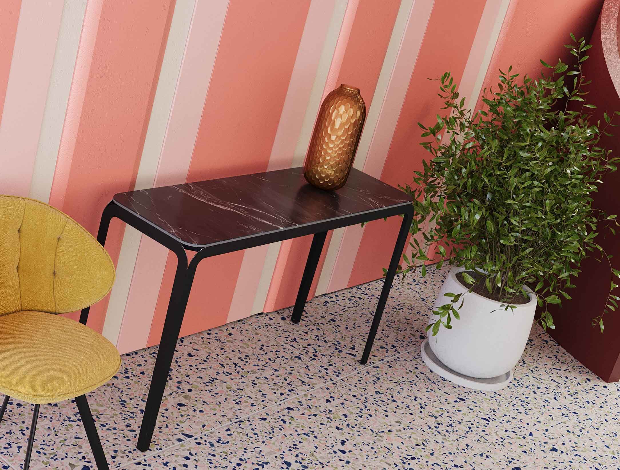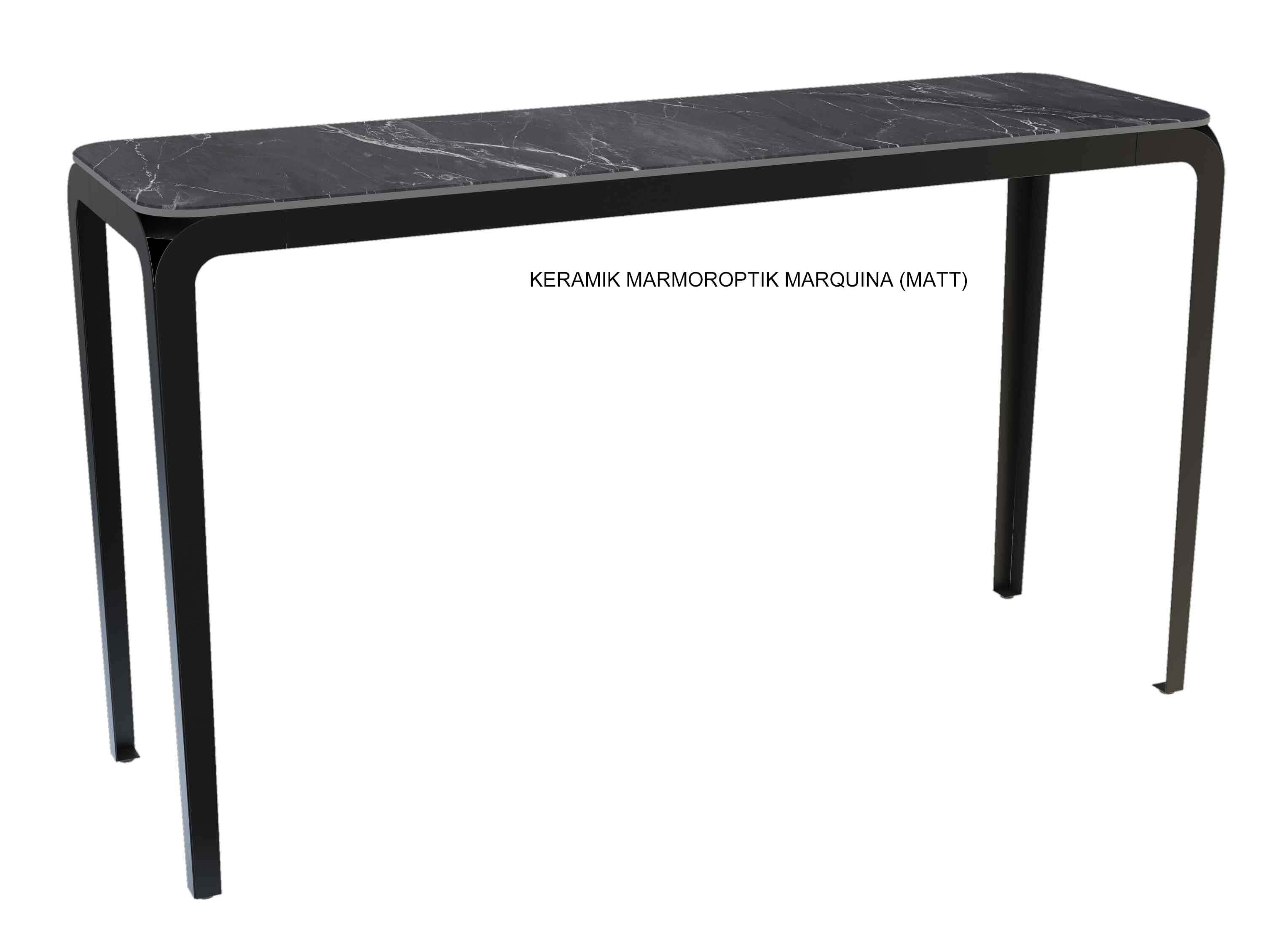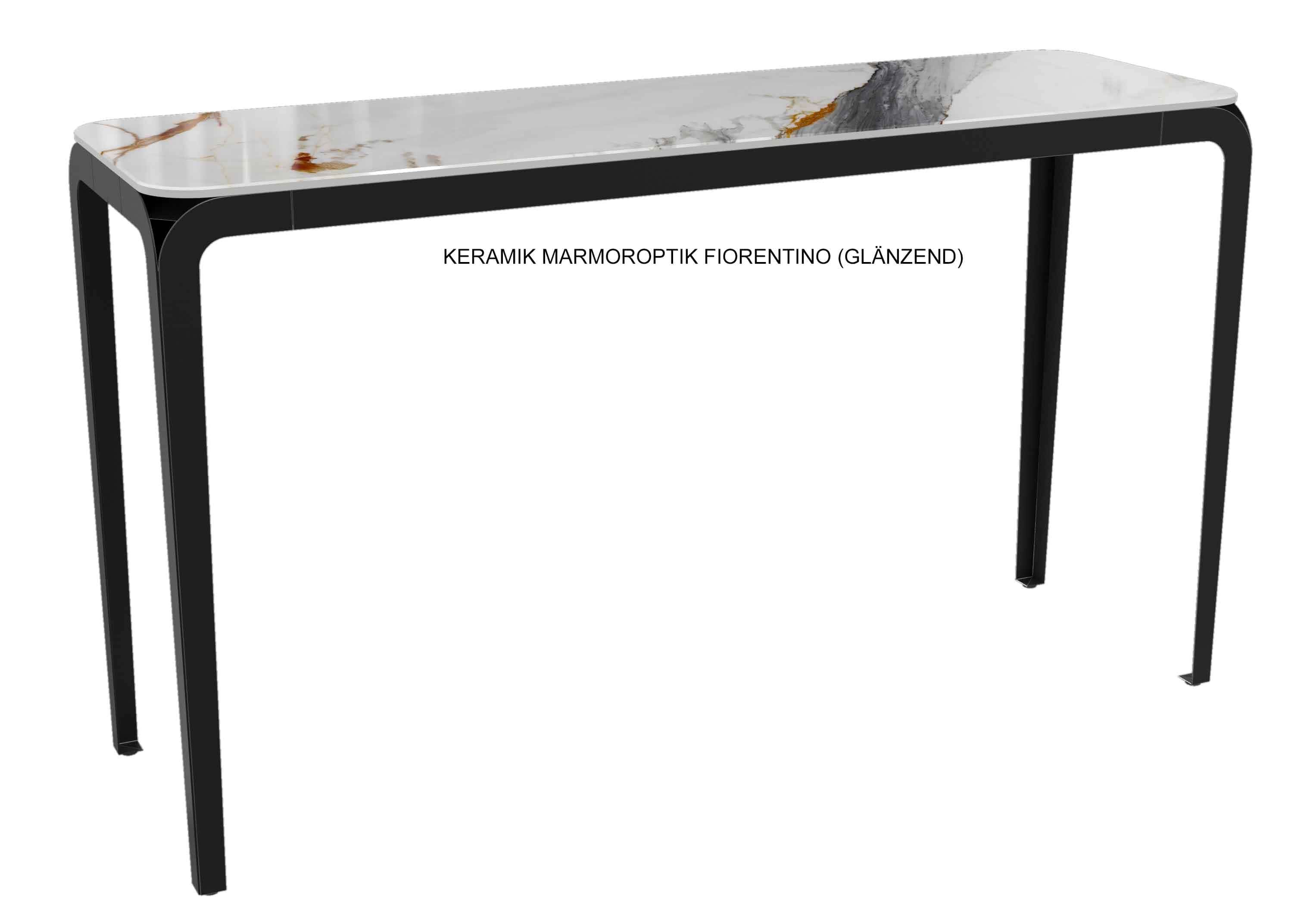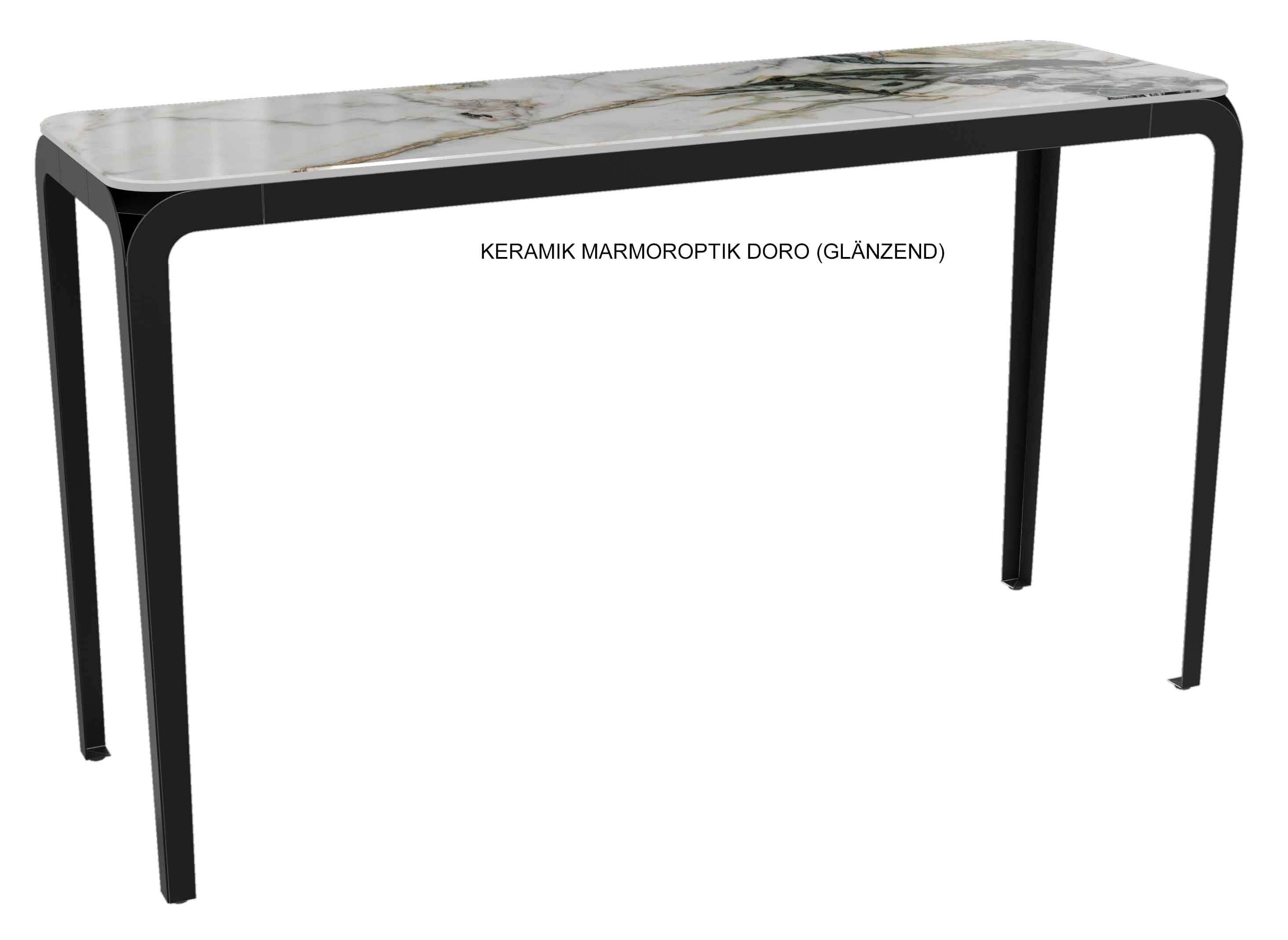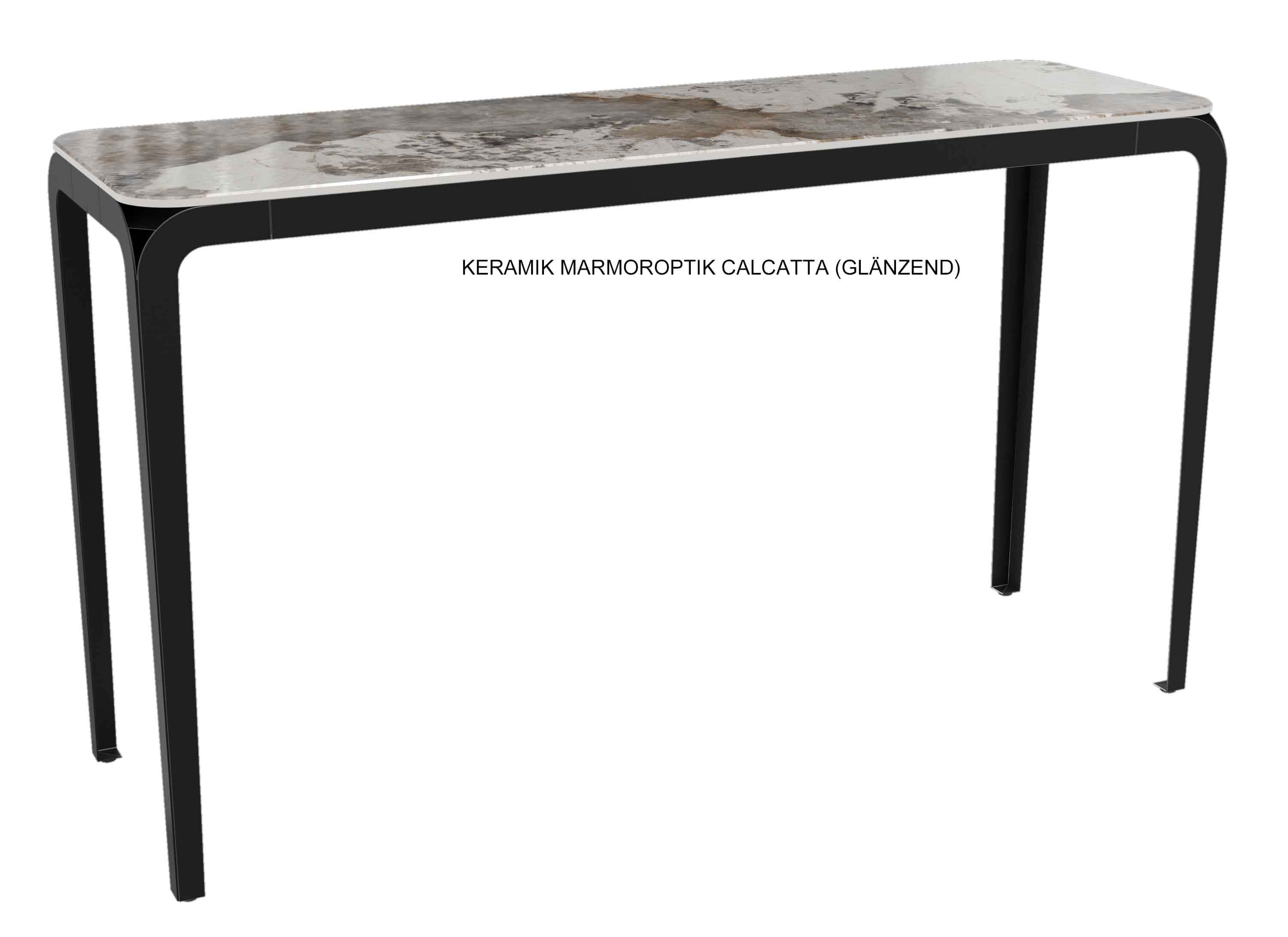 Ein Konsolentisch kann aufgrund seiner schmalen Bauweise in kleineren oder schmalen Räumen als zusätzliche Ablage genutzt werden. Im Flur sorgt er mit einer schönen Deko für einen ersten einladenden Eindruck oder man benutzt ihn als Ablage für Schlüssel, Schirme und andere kleine Utensilien. Besonders beliebt ist er im Schlafzimmer als Schminktisch oder Frisiertisch. Hinter dem Sofa plaziert, kann man darauf mit einer schöne Lampe für optimale Lichtverhältnisse sorgen. Diese Konsole mit dem minimalistischen schwarzen Metallgestell ist mit einer auf Glas verklebten Keramikplatte ausgestattet. Diese Platte erhalten Sie in verschiedenen Designs von Marmoroptik, welche besonders edel jeden Raum aufwertet.