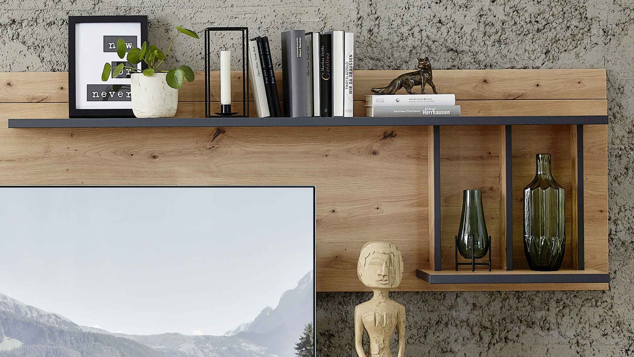 Leben Sie im Einklang mit der Natur und entscheiden Sie sich für diese gemütliche Wohnwand in artisan eiche Nachbildung. Der rustikale Charakter der Wohnwand wird durch die Akzente in Hirnholz-Nachbildung bedingt, welche durch die anthrazitfarbige Rahmung besonders hervorspringen. Schmale Metallgriffe ebenfalls anthrazitfarbig fügen sich harmonisch in`s Gesamtbild ein. Die abgerundeten Fronten verleihen der Wohnwand eine sanfte, einladende Ausstrahlung, welche den wohnlichen Charakter unterstreicht. Der Komfort setzt sich in hochwertigen Dämpfungsbeschlägen für alle Türen und Schubladen fort, was ein weiteres Kaufargument darstellt. Der Vitrinenschrank, das TV-Lowboard und das Wandregal können aufgrund der modularen Bauweise angepasst an Ihre Raumsituation gestellt und durch weitere Elemente bei Bedarf ergänzt werden. Schauen Sie dazu in den Typenplan und kontaktieren unser freundliches Team bei Bedarf direkt.