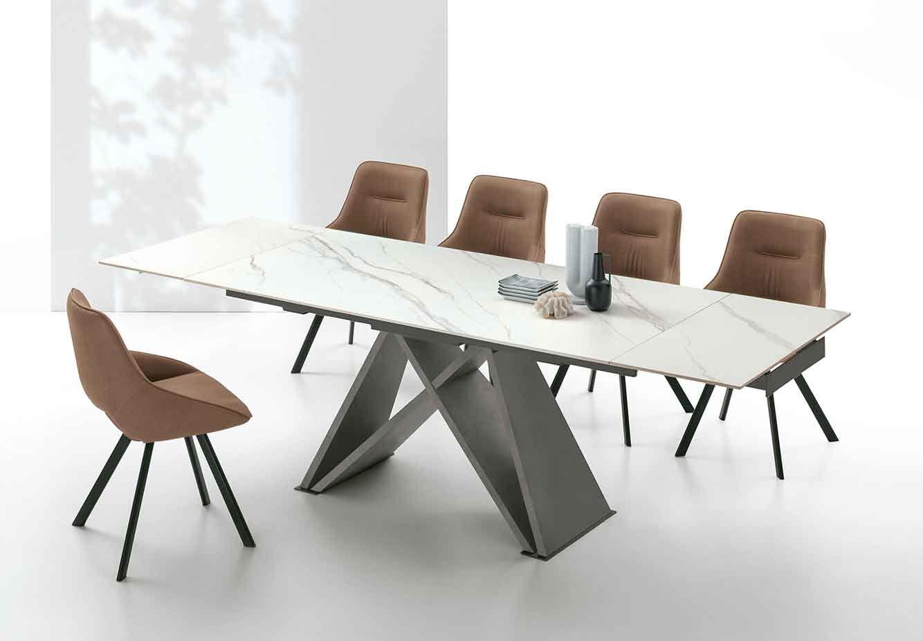 Dieser Esstisch von Target Point kombiniert Funktionalität und Robustheit mit einer eleganten Ausstrahlung, die Ihrem Essbereich das gewisse Etwas verleiht. Die Tischplatte, aus hochwertigem Feinsteinzeug im edlen Marmor-Look, misst 180x90 cm und bringt durch ihr klassisches Design zeitlose Eleganz in Ihr Zuhause. Das verwendete Gres Feinsteinzeug ist besonders widerstandsfähig gegenüber Kratzern, Stößen, Flecken, Temperaturschwankungen und chemischen Einflüssen. Zudem ist die Oberfläche pflegeleicht und hygienisch, da sie keine Flüssigkeiten aufnimmt. Die stilvolle Tischsäule des Delta-Tisches sorgt für eine angenehme Atmosphäre und kann mit einer dezenten Marmor- oder Holzstruktur in den Farben Silber, Bronze oder Graphit perfekt auf die verschiedenen Nuancen der Tischplatte abgestimmt werden. Mit dem praktischen Auszugsmechanismus lässt sich der Tisch auf 225 oder sogar 270 cm verlängern, sodass er flexibel an Ihre Bedürfnisse angepasst werden kann.