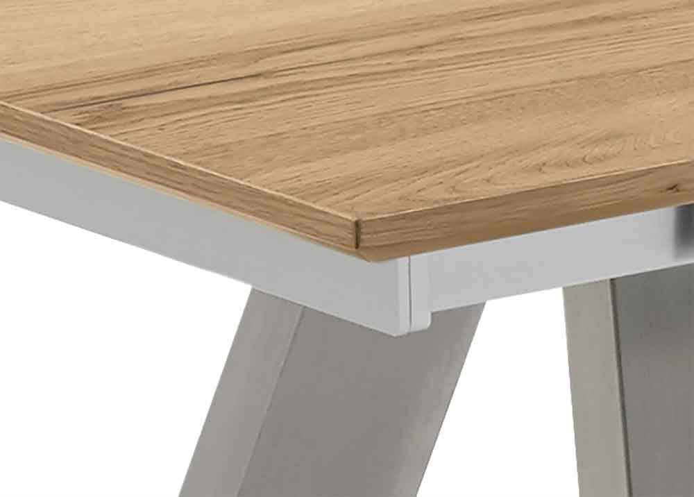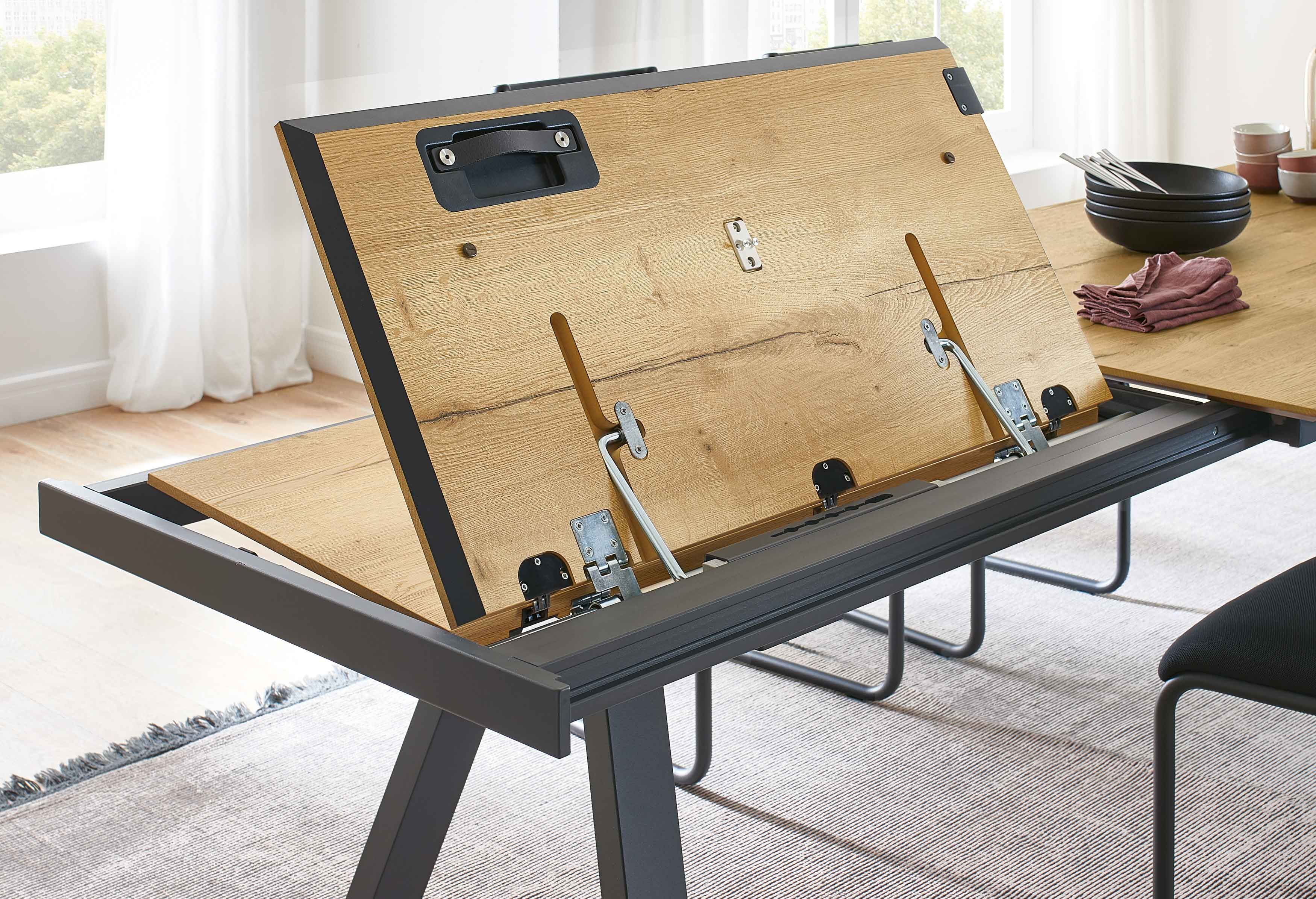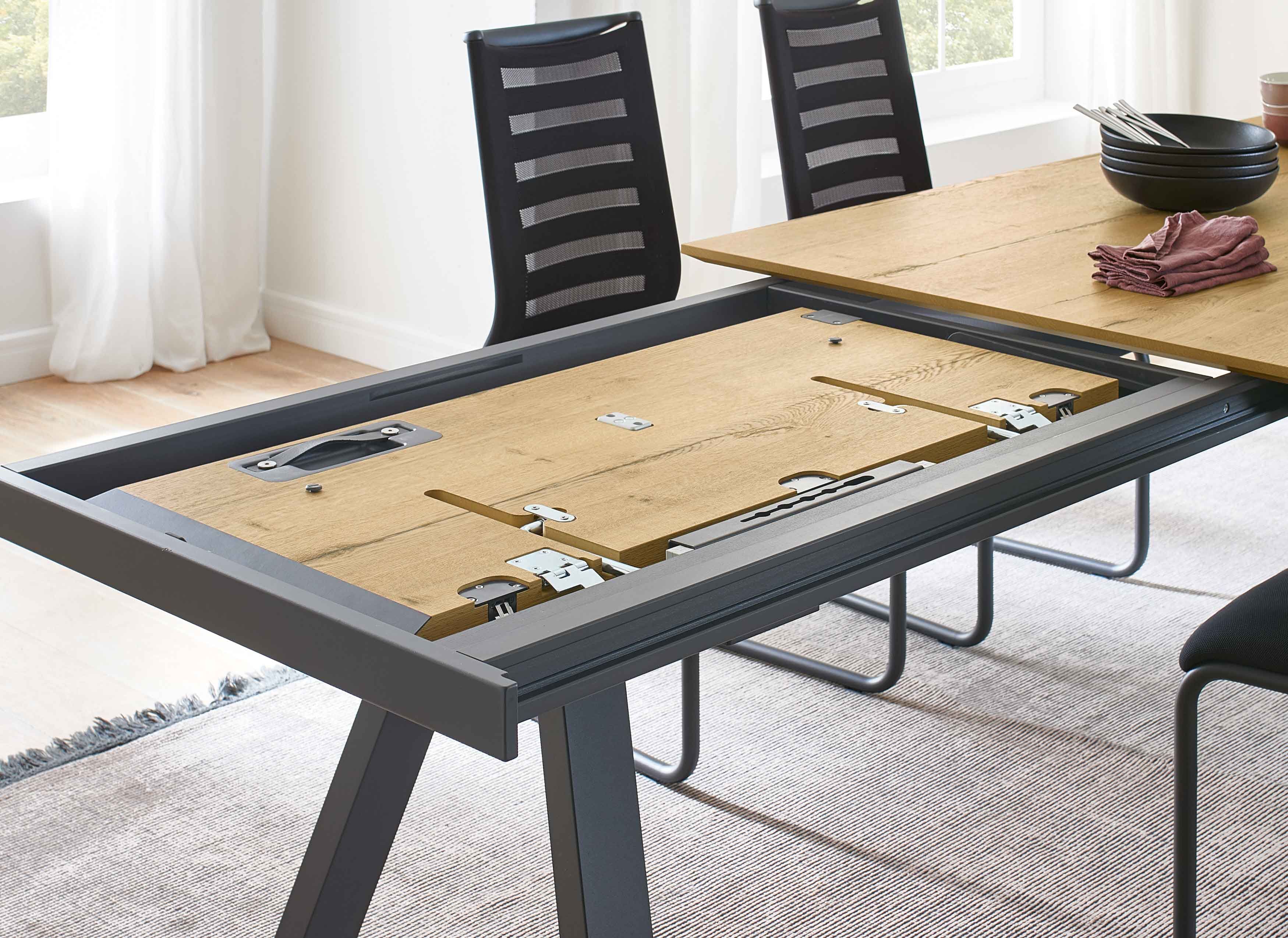 Furnierte Tische sind nicht nur deutlich preisgünstiger als Vollholz-Modelle, sie sind auch leichter, da das Trägermaterial MDF ein geringeres Gewicht hat. Gleichzeitig neigen sie weniger dazu, sich bei Temperaturschwankungen oder trockener Luft zu verziehen – ein typisches Problem bei Massivholz. Diese Formstabilität macht furnierte Tische besonders langlebig im alltäglichen Gebrauch. Das markante Spiderbein-Gestell verleiht dem Klu von Venjakob eine ausdrucksstarke, moderne Optik. Je nach Ausführung können Sie die Beine passend zum gewählten Holzton, in anthrazit matt oder in Edelstahloptik erhalten. Damit lässt sich der Tisch harmonisch in nahezu jedes Wohnambiente integrieren – von rustikal bis elegant-modern. Besonderen Komfort bietet die optionale Auszugsfunktion: Der Frontauszug mit Klappeinlagen und Rollen ermöglicht eine einfache, kraftsparende Bedienung. So lässt sich der Esstisch im Handumdrehen erweitern, wenn mehr Platz für Familie, Gäste oder besondere Anlässe benötigt wird. Die fein abgeschrägte Tischkante betont die hochwertige Verarbeitung und verleiht dem Möbelstück eine filigrane, elegante Nuance. Wählen Sie aus verschiedenen Tischgrößen die Variante, die ideal zu Ihrem Essbereich passt. Als Richtwert gilt ein Platzbedarf von ca. 60 cm pro Sitzplatz, um ausreichend Bewegungsfreiheit zu gewährleisten.